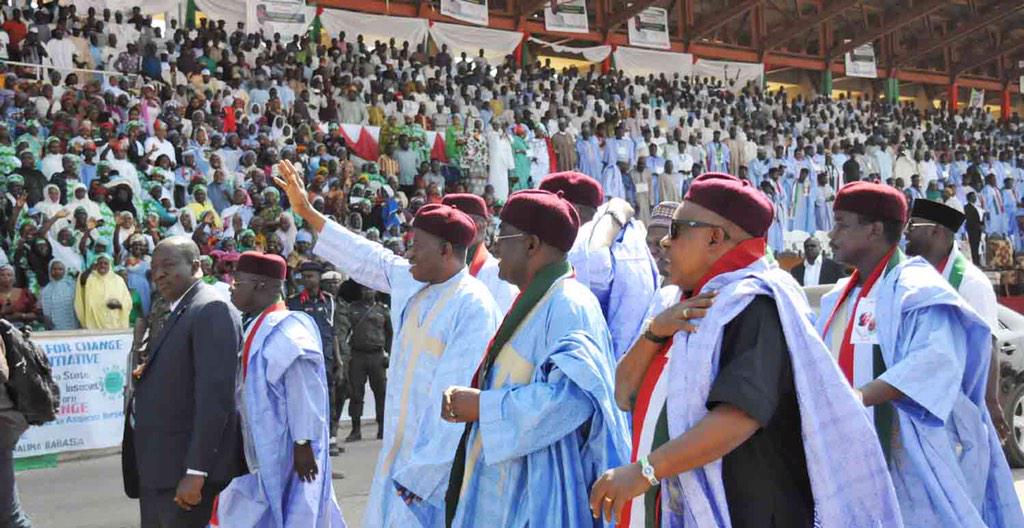 | The Shehu of Borno welcoming President Jonathan to his palace today |
